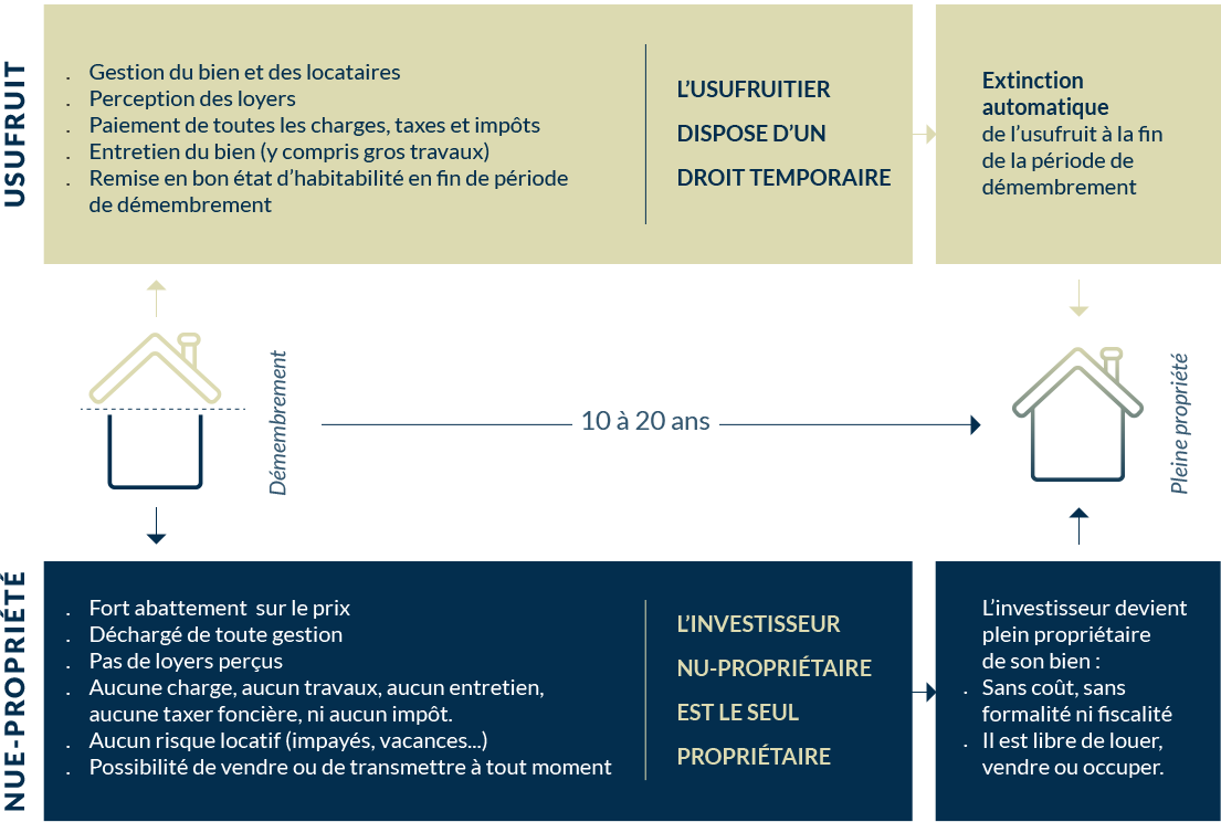 Pendant toute la durée de l'usufruit, l'investisseur nu-propriétaire ne perçoit aucun loyer mais ne paye aucune charge, aucune taxe ni aucun impôt sur le bien. Il ne s'occupe d'aucune gestion et n'a aucune contrainte. L'investisseur est libre à tout moment de vendre ou de transmettre son bien immobilier à ses enfants ou petits-enfants quand il le souhaite.