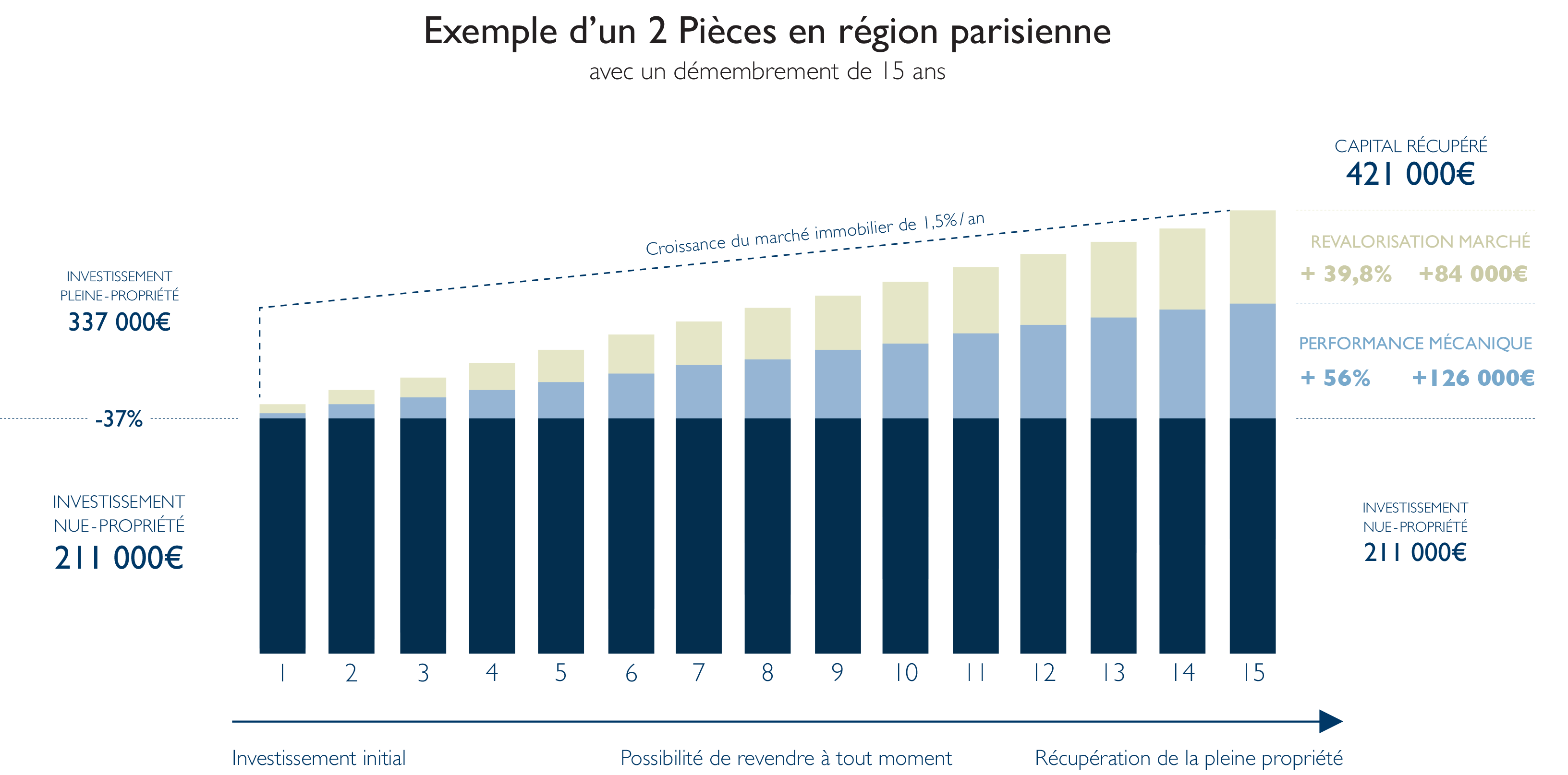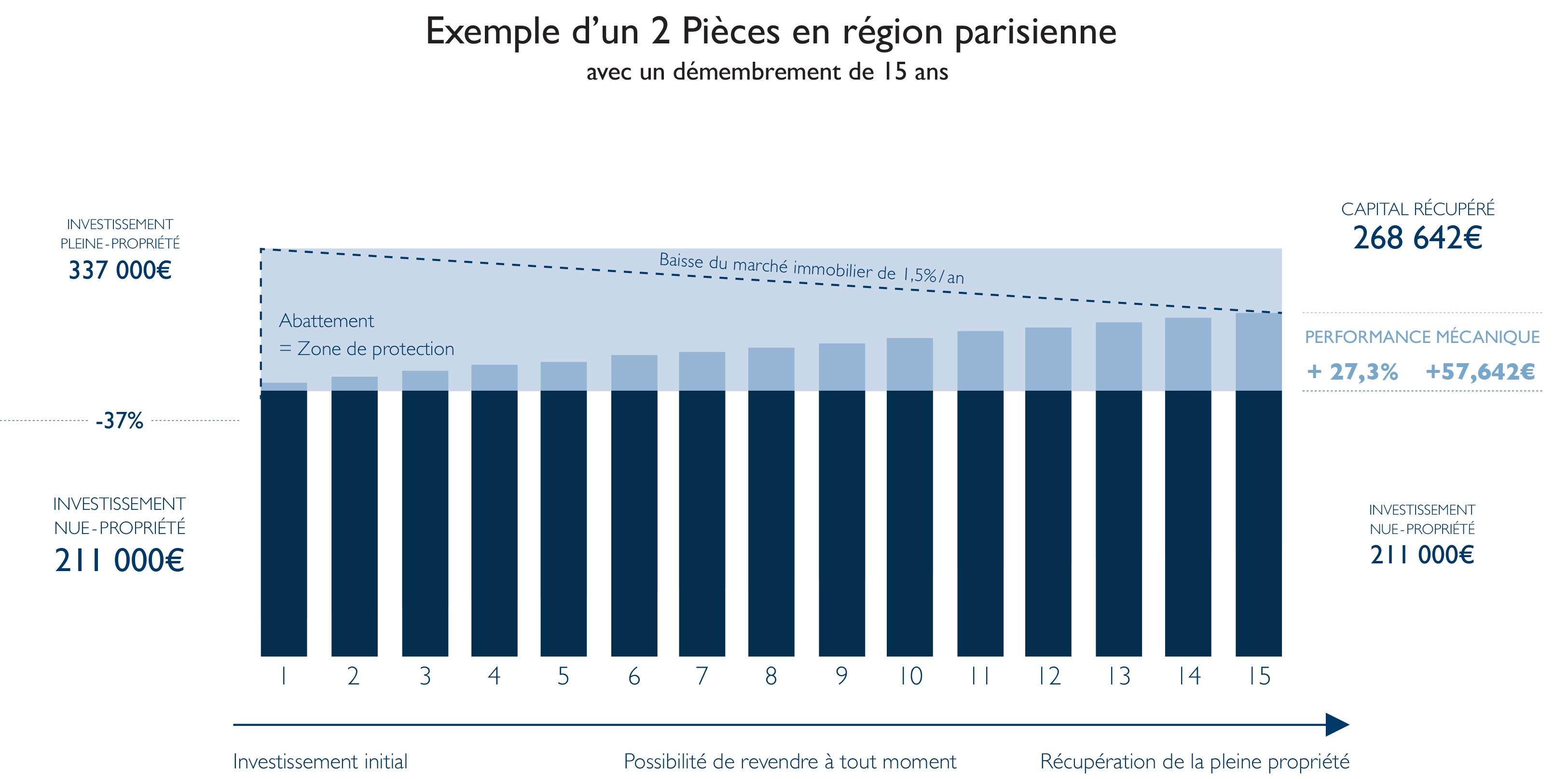 Ainsi, à marché immobilier constant, l'investissement en nue-propriété prendra de la valeur de manière continue et progressive jusqu'à la fin du démembrement.
