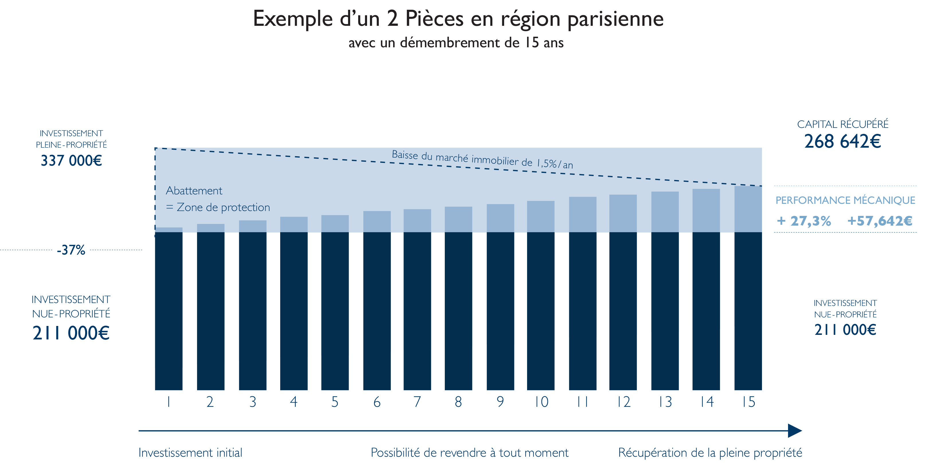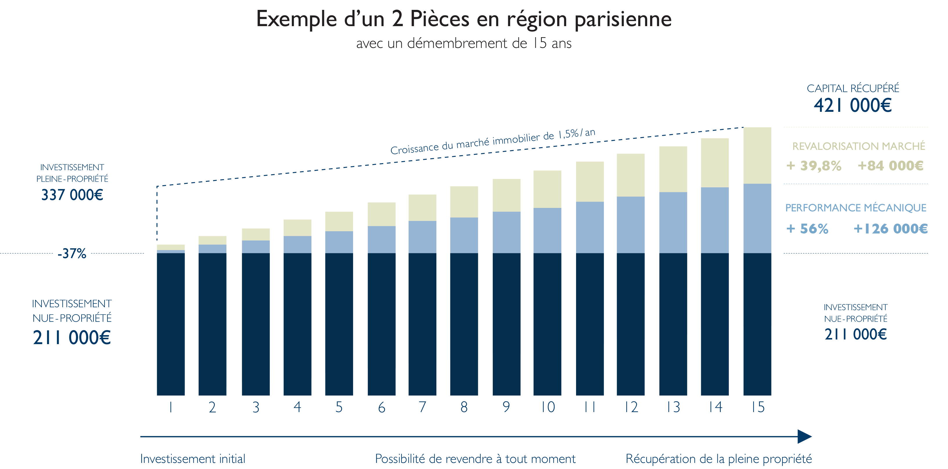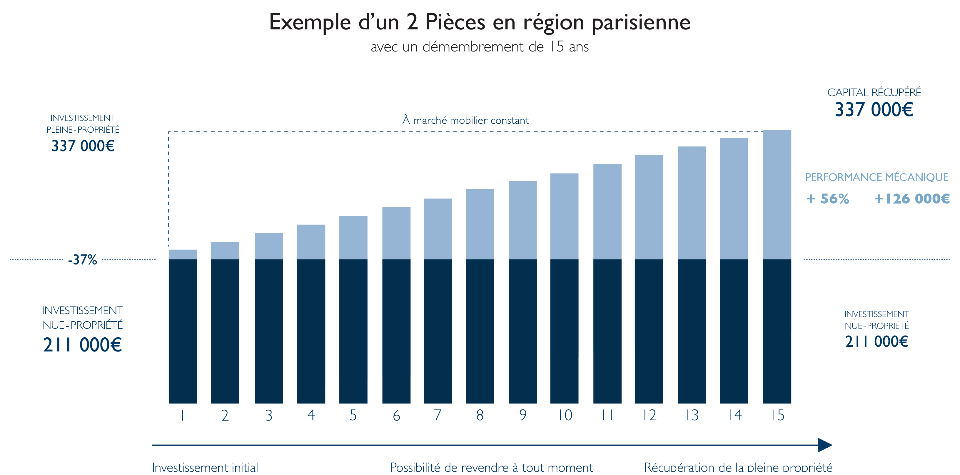 Ainsi, à marché immobilier constant, l'investissement en nue-propriété prendra de la valeur de manière continue et progressive jusqu'à la fin du démembrement.